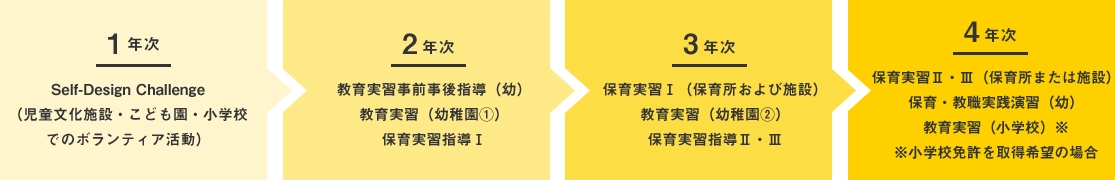 小学校教育を主とする「学校教育コース」の仲間と共に学び合い、また、地域と一体化した豊富な体験や実習を通して、これからの保育者に必要な素養を身に付けていきます。「Self-Design Challenge(S-Dチャレンジ)」を通して、自分自身の適性に向き合ったうえで、2年次からの保育実習・教育実習(幼稚園)に進みます。