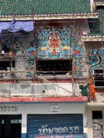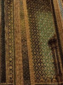 タイで訪れた寺院のデザインは日本にある寺院のデザインと比較すると派手なデザインの寺院が多かった。私は、なぜ派手なデザインの寺院が建設されたのか疑問を持った。そのため、帰国後にタイの寺院について調査した。ウェブサイトのバンコクがより楽しくなる旅行記によると「金色は縁起が良く、ブッタの偉大さのシンボルとして親しまれてきた」「バンコクでは、装飾品やその周辺にも金箔が多用されている」と掲載されていた。また、タイには身体の悪いところに金箔を塗る習慣があることも分かった。これらのことから、タイでは仏教の影響により金色が親しまれており、寺院が派手なデザインであることが分かった。また、現地では1つ1つ手作業で張り付けをしている作業員を目にした。