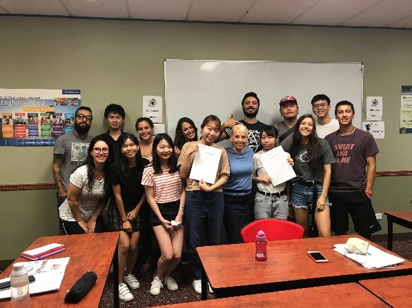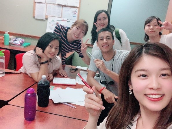 私のクラスには日本以外からもコロンビア、ブラジル、スイス、タイ、台湾などから学びに来ており多国籍な環境で英語を学ぶことができた。そのような環境の中で私はスピーキング能力が他の生徒と比べて劣っていることに気が付いた。また、日本の授業と違い指名されることが少なく分かった人から答えを言うので、最初のうちは他の生徒の積極性に圧倒されてしまい発言する機会が少なくなってしまっていた。授業内容としてはペアワークが多かったが英語で自分の考えを説明することが難しく相手の話す量と比べて圧倒的に自分が話す量が少ないと感じた。レベル分けテストによってクラス分けをしてあるため同じくらいのレベルのはずなのになぜこんなにもスピーキングの力に差があるのか不思議に思った。そこでスピーキングが得意な生徒に注目してみると、英語が正確か正確でないかということよりもとりあえずたくさん話すということを優先していることが分かった。私は英語を話すときに文法や単語が正確かどうかを気にしてしまい話すのに時間がかかってしまうことがスピーキング能力が伸びない原因の1つだということを学んだ。それからは自分から積極的に発言すること心掛け、間違えてしまった時には先生やクラスメイトが指摘してくれるため、自然とスピーキング能力が伸び正しい英語で話せるようになった。さらに英語をたくさん話せるように、休み時間には日本人以外のクラスメイトとコミュニケーションを取るように心掛けていた。学校での学びを通して英語で話すことの楽しさに気が付くことができた。
