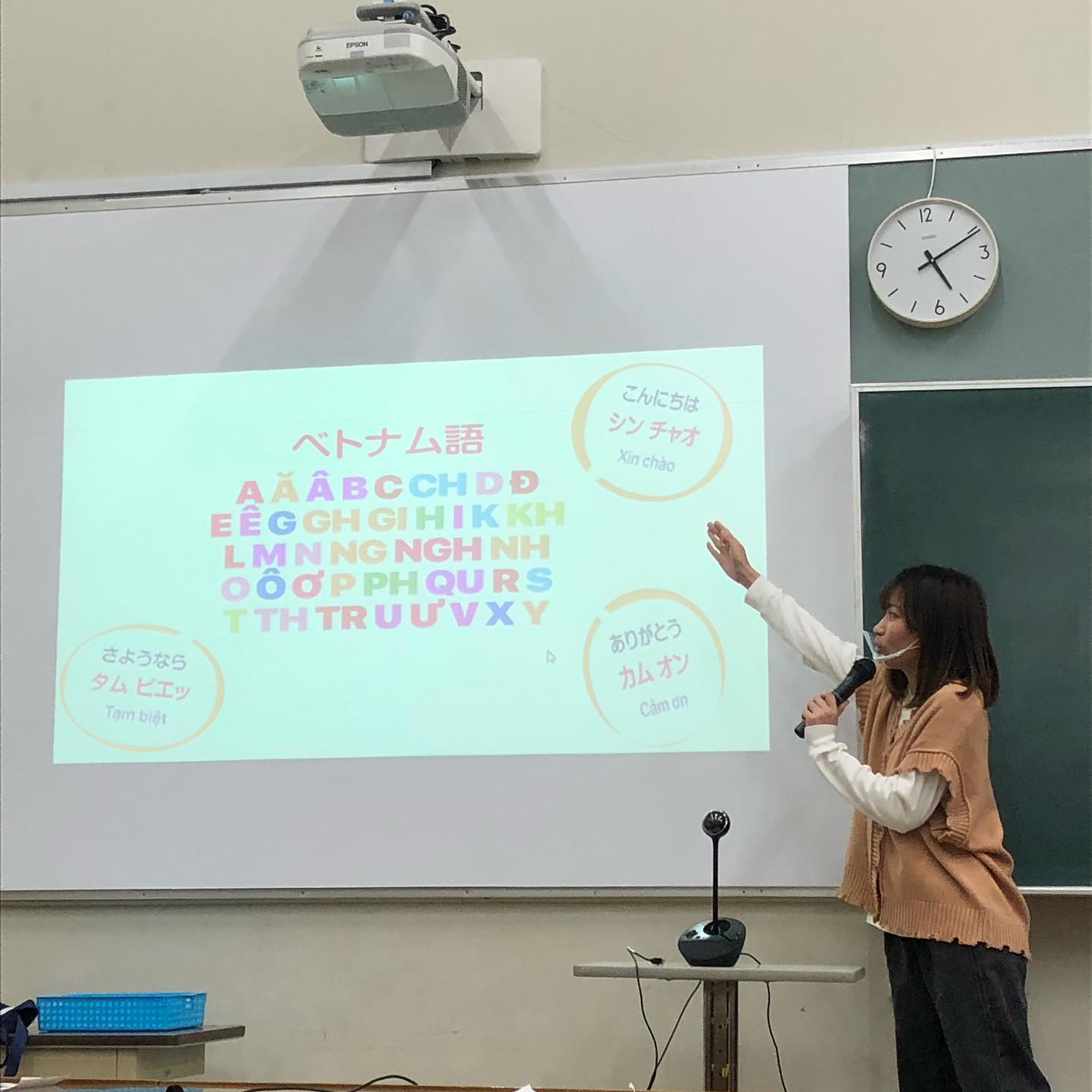 この授業では、ブルガリア・ルーマニア・ベトナム語の基礎表現を学びます。ベトナム語編では、過去に交換留学生としてベトナムから本学に来ていた方にレクチャーしていただきました。