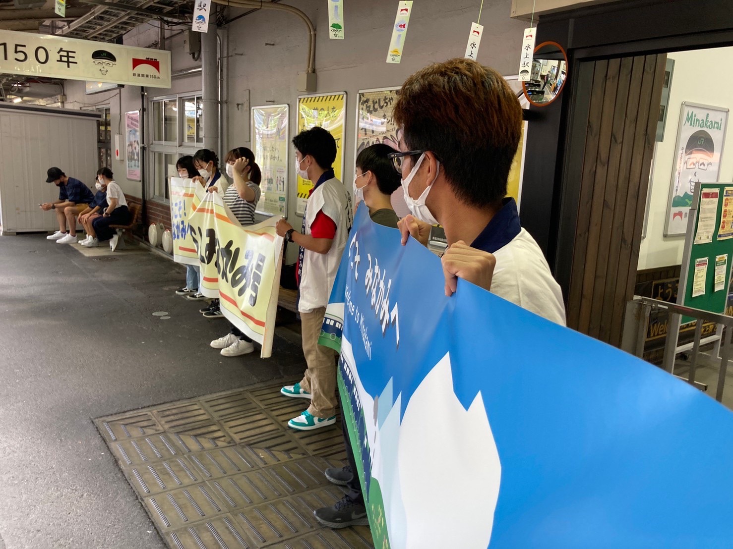 SLお出迎えでは、午前中はおいでちゃん(水上温泉旅館協同組合公式キャラクター)と一緒にみなかみ駅に到着するSLと乗客のみなさんを「いらっしゃいませ」と言いながら横断幕を持ってお出迎えしました。また、午後はみなかみ駅を発車するSLと乗客に手を振りながら見送りました。地域の方々の元気な声と多くの乗客でより活気ある水上駅を見ることができました。
