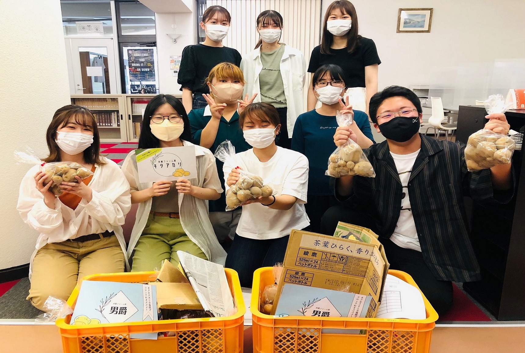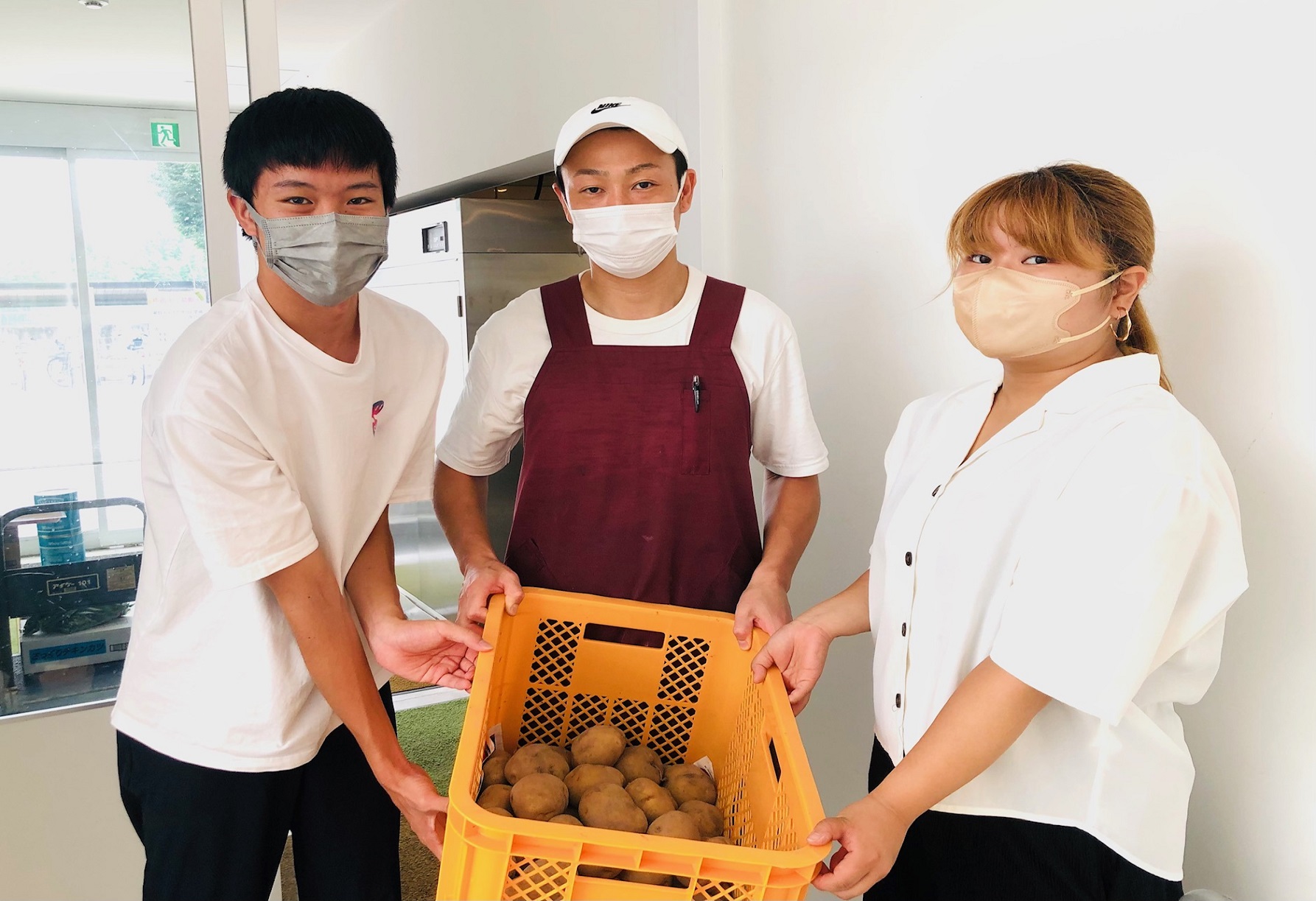 - 収穫したジャガイモを大学食堂店の店長さんへ