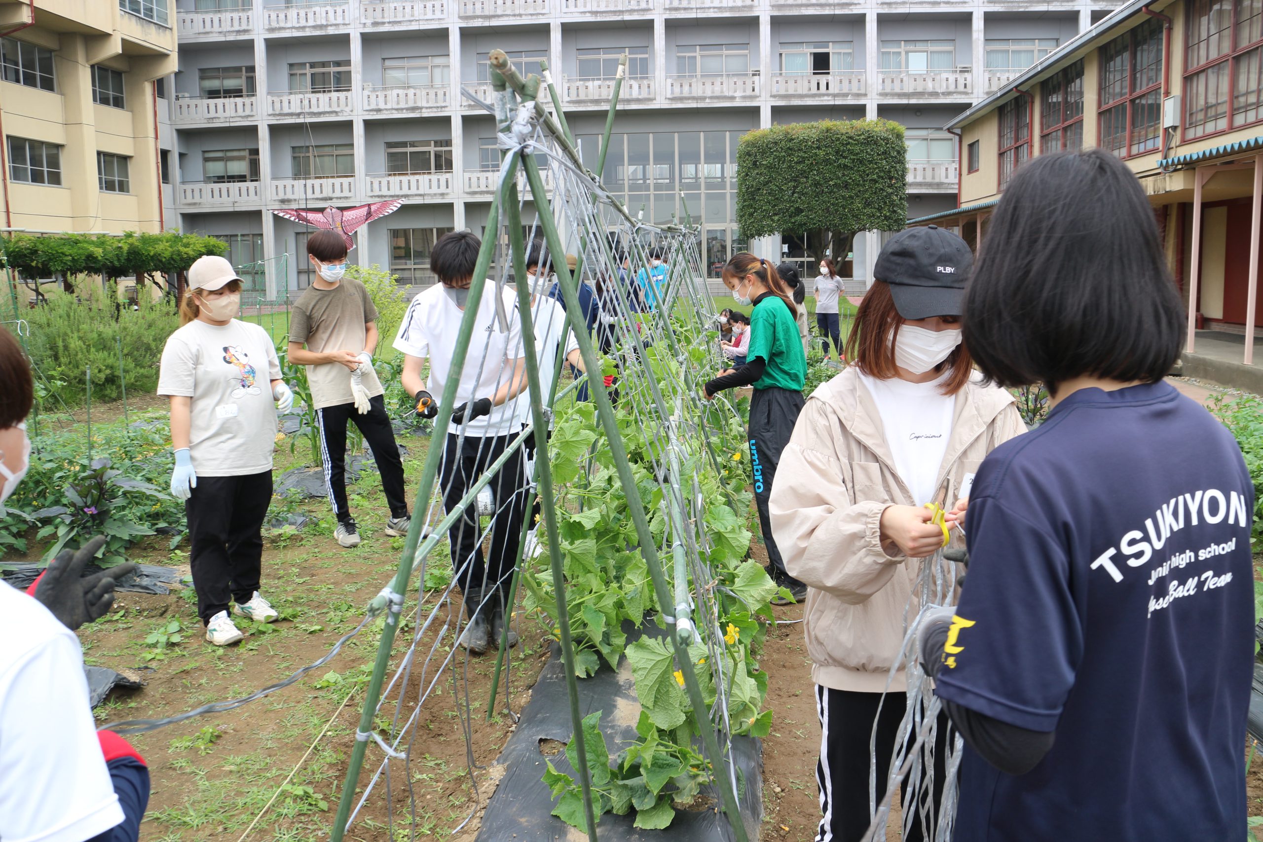 - きゅうりの支柱建て作業(短大農園)