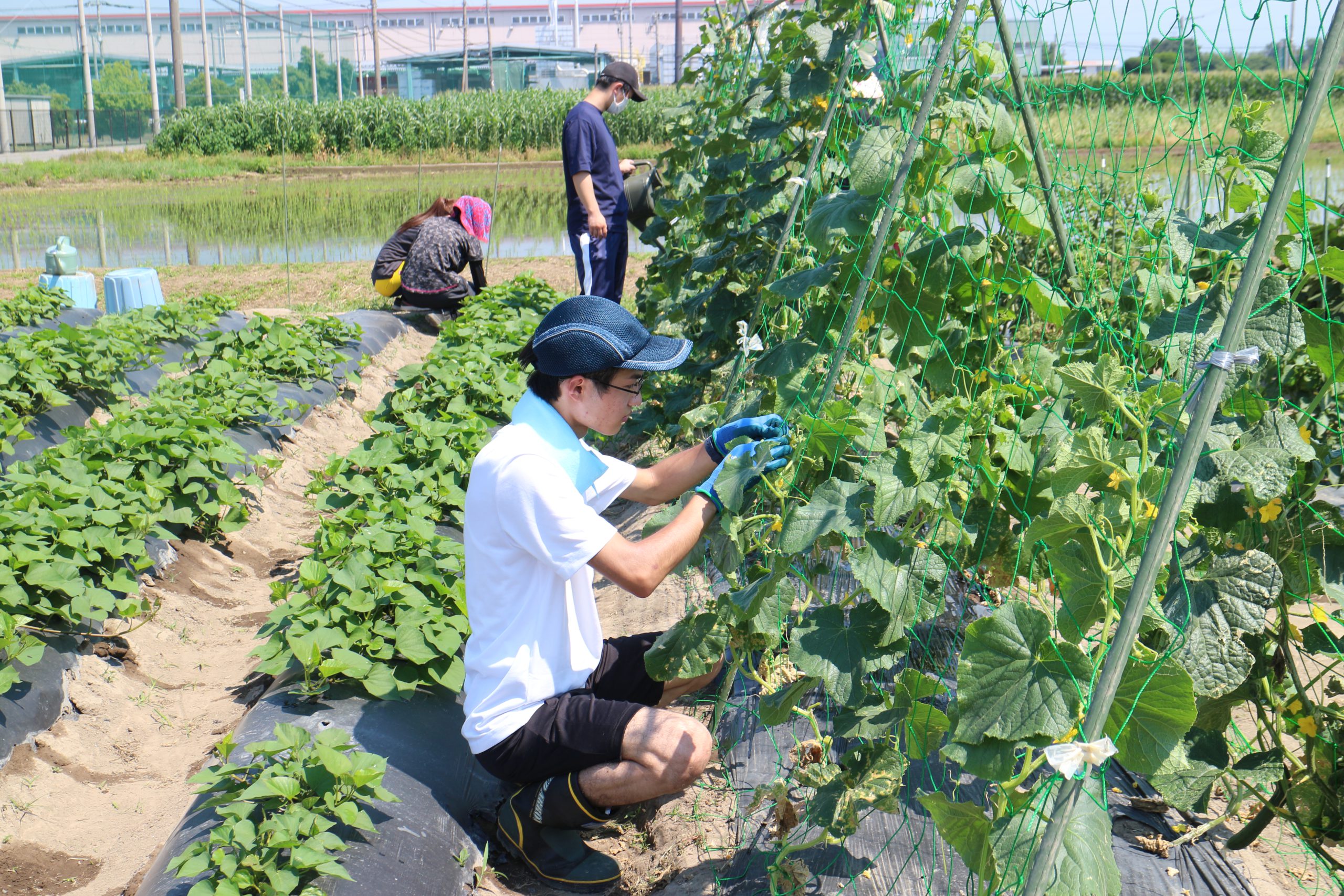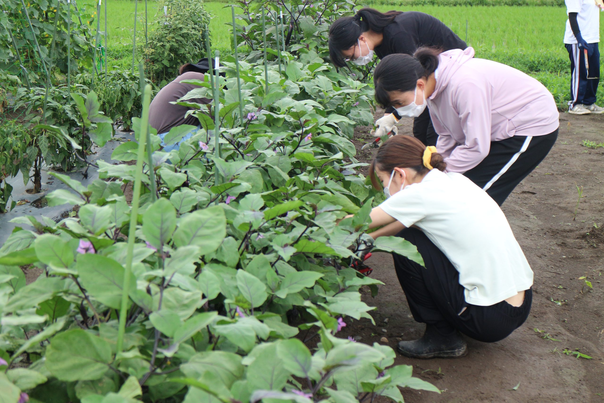 - 夏野菜の水やり、摘心作業(大学農園)