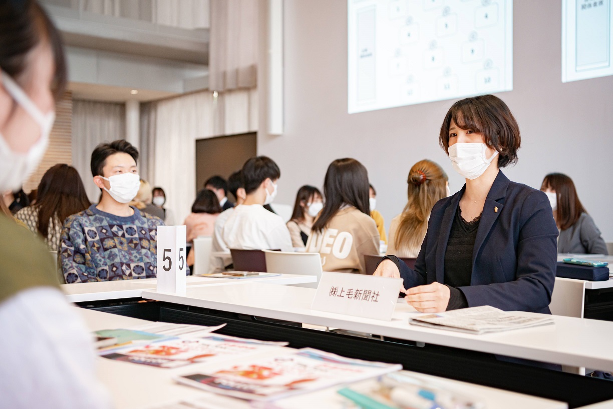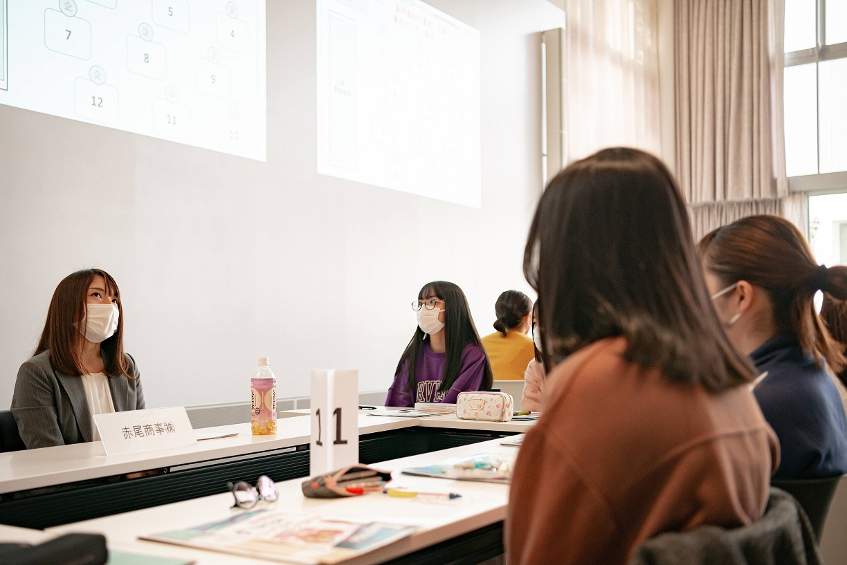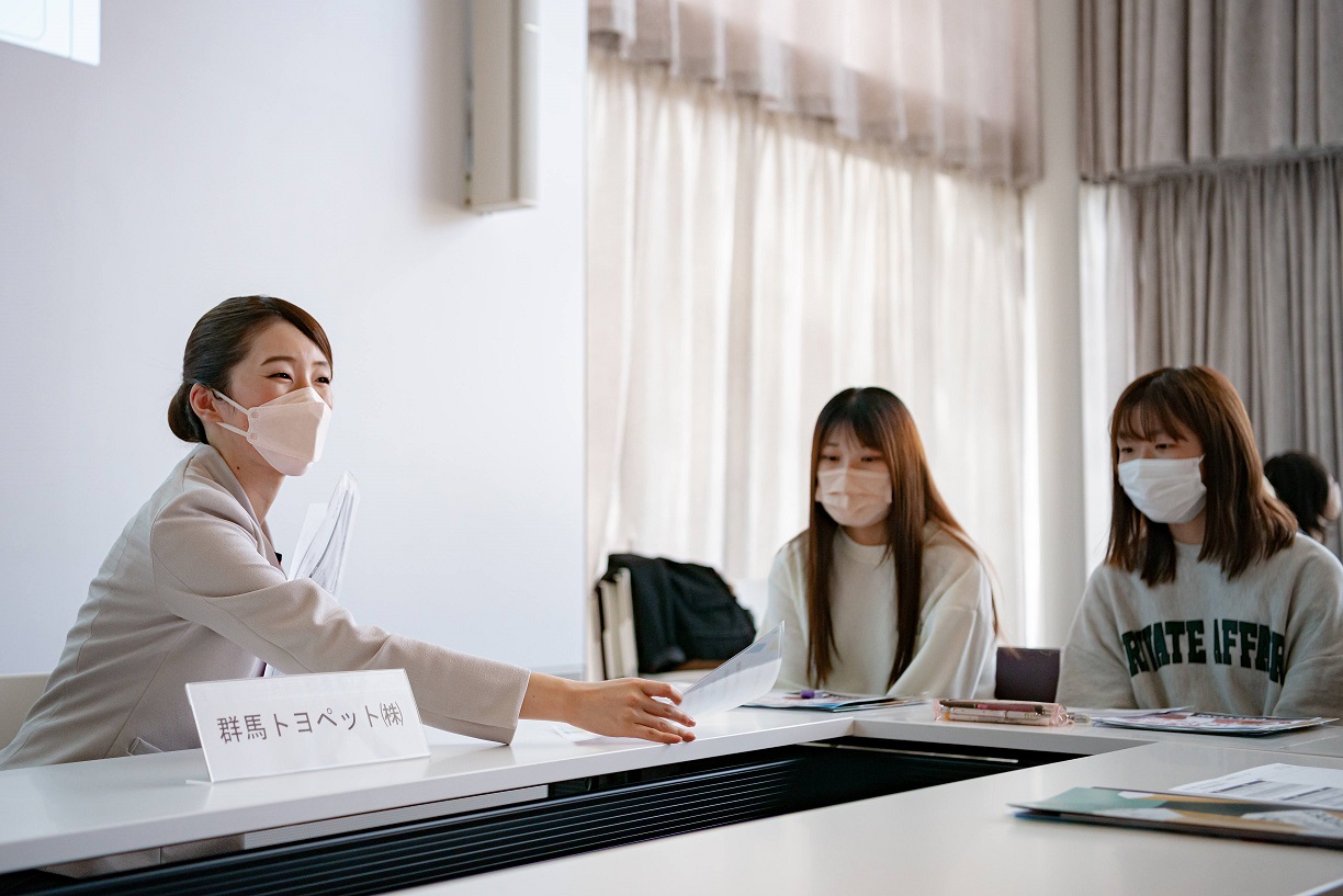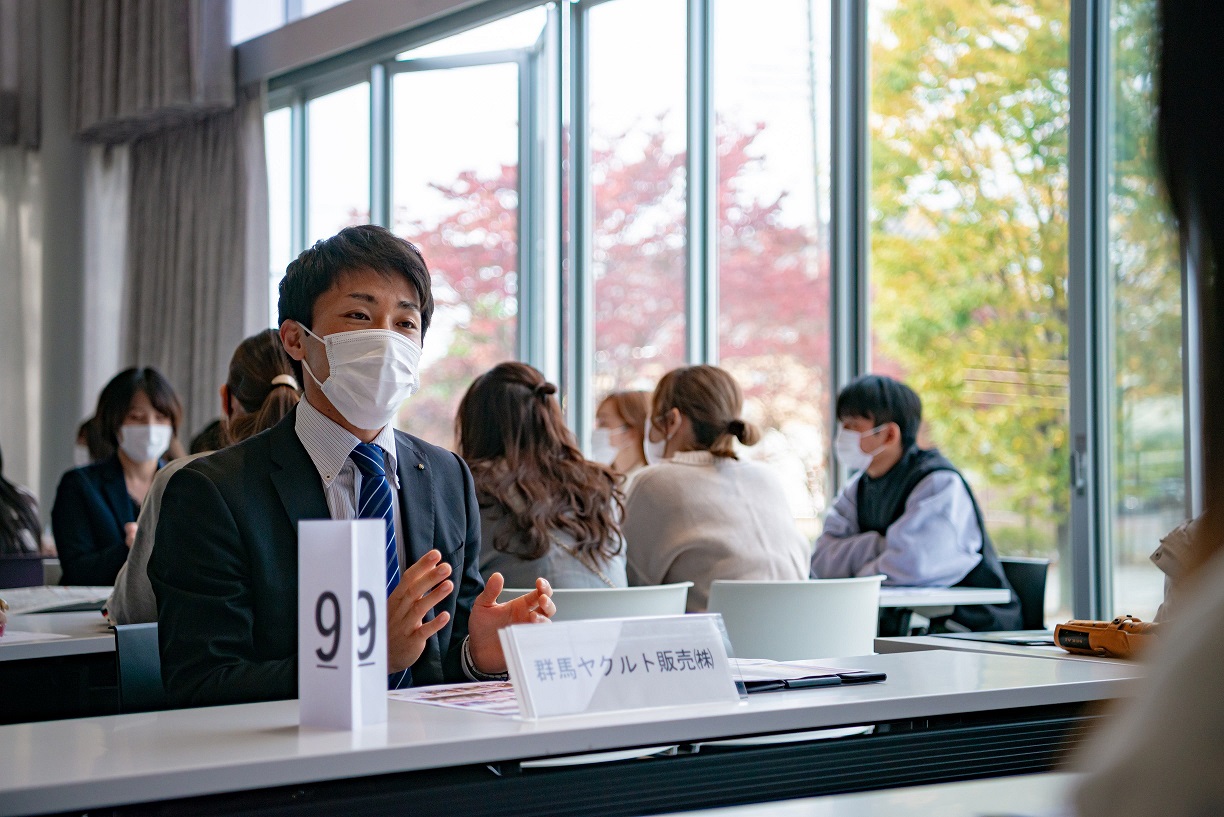 卒業後の進路を考えるきっかけづくりの一環として、また地元企業の魅力を大学生に伝える機会として、県内企業6社をお招きし、心理・人間文化コース1年生との交流会「ぐんま若者シゴトーク」が行われました。これは、県と上毛新聞社が共催で行っており、本学以外の県内他大学でも実施されています。
