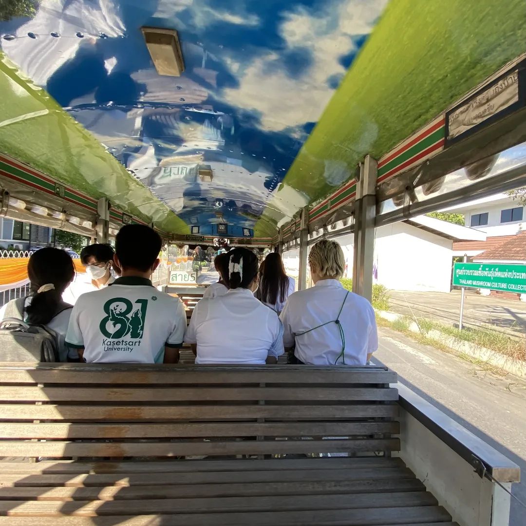 登下校の際は、2枚目の写真のようなシャトルバスを使用しています。しかし、現地の学生は、バイクタクシー(学内20バーツ=約80円)を使用する人の方が多い印象です。なぜ無料のバスがあるのに、みんなバイクタクシーを使うのか現地の友人に聞いたところ、「暑い中、歩くのもバスを待つのも嫌だし、一番速い手段だから。」とのことです😃