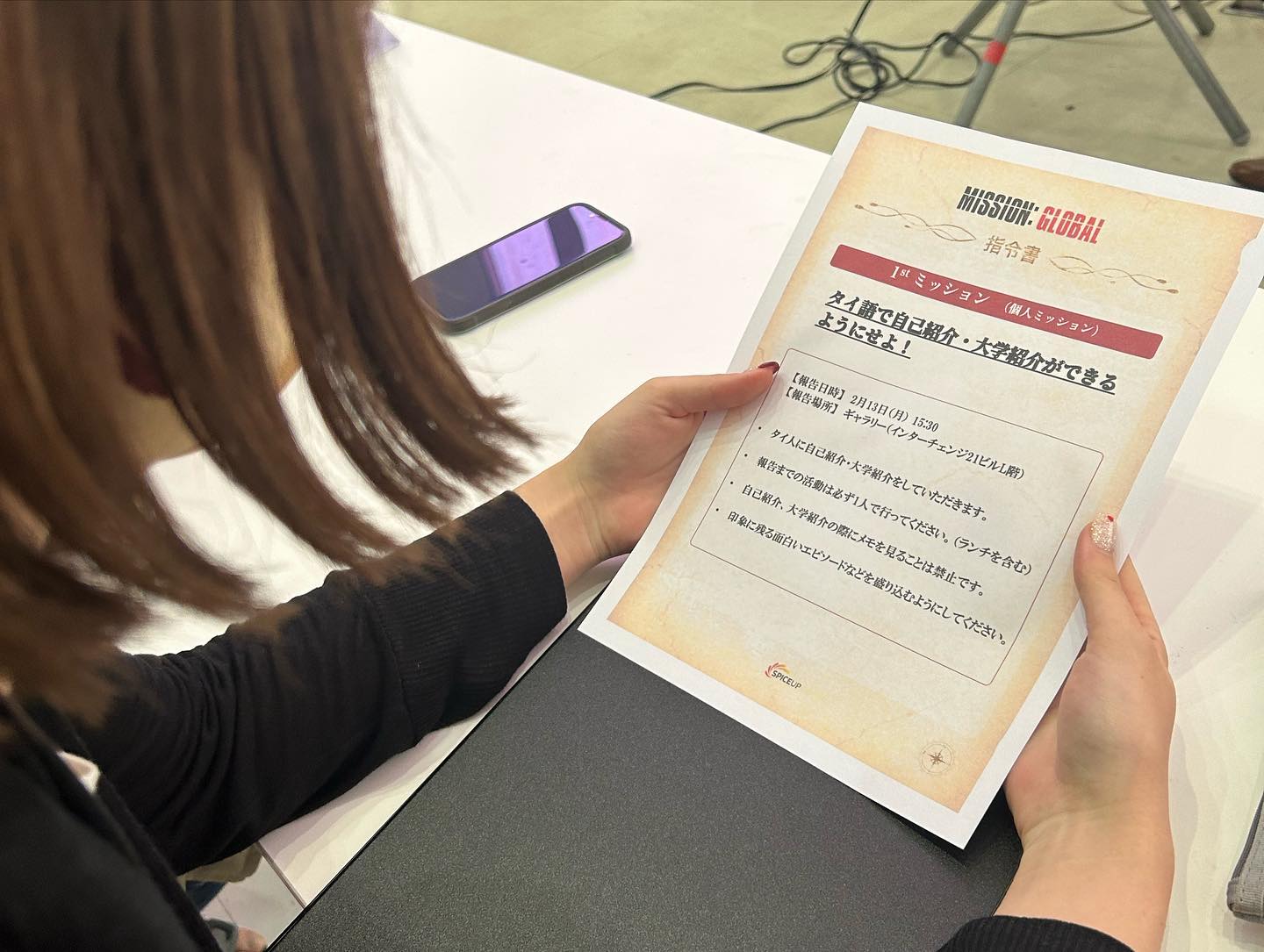 個人ミッションの一例は、「タイ語で自己紹介と大学紹介をせよ」。限られた時間の中で、現地のタイ人にタイ語で自己紹介と大学の紹介をしなければなりません。しかも、実際に話をするときはメモも見てはいけないという徹底ぶりです。
