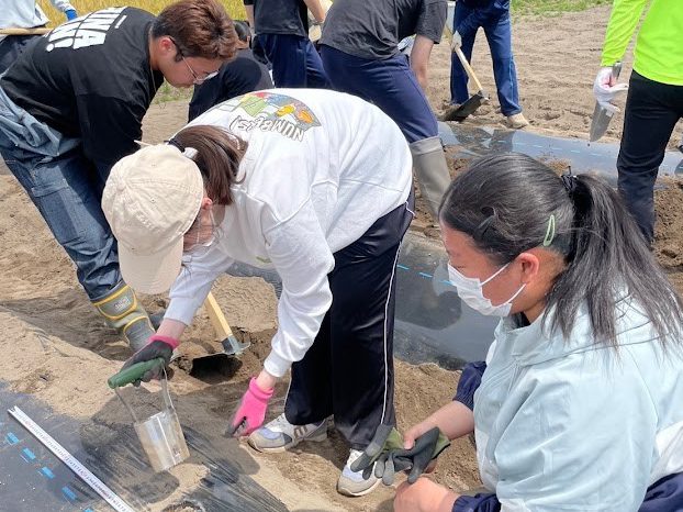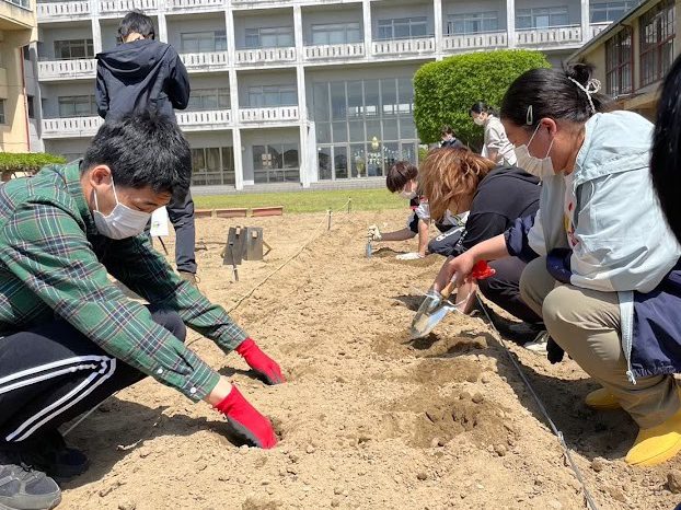 - 短大生と植え付け作業(短大農園)