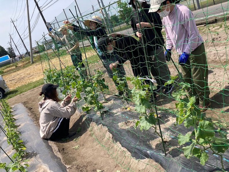 - きゅうりのネット張り(大学農園)