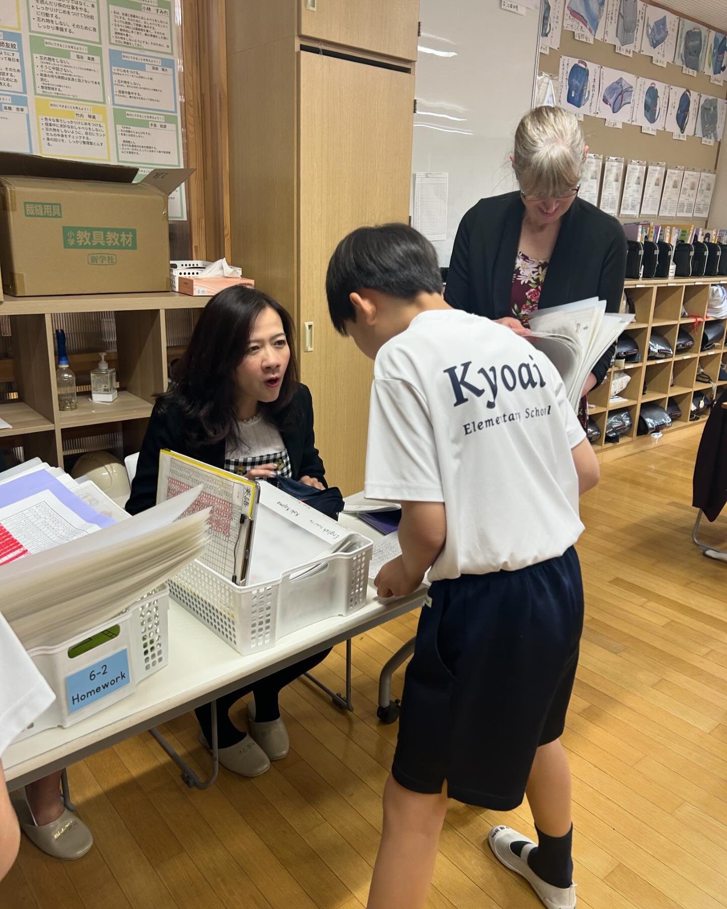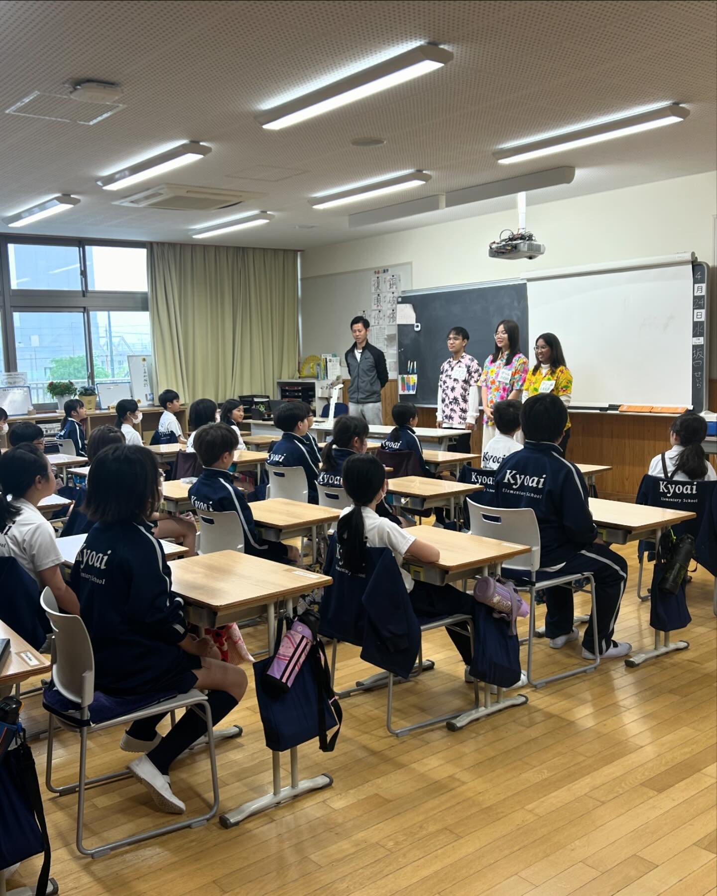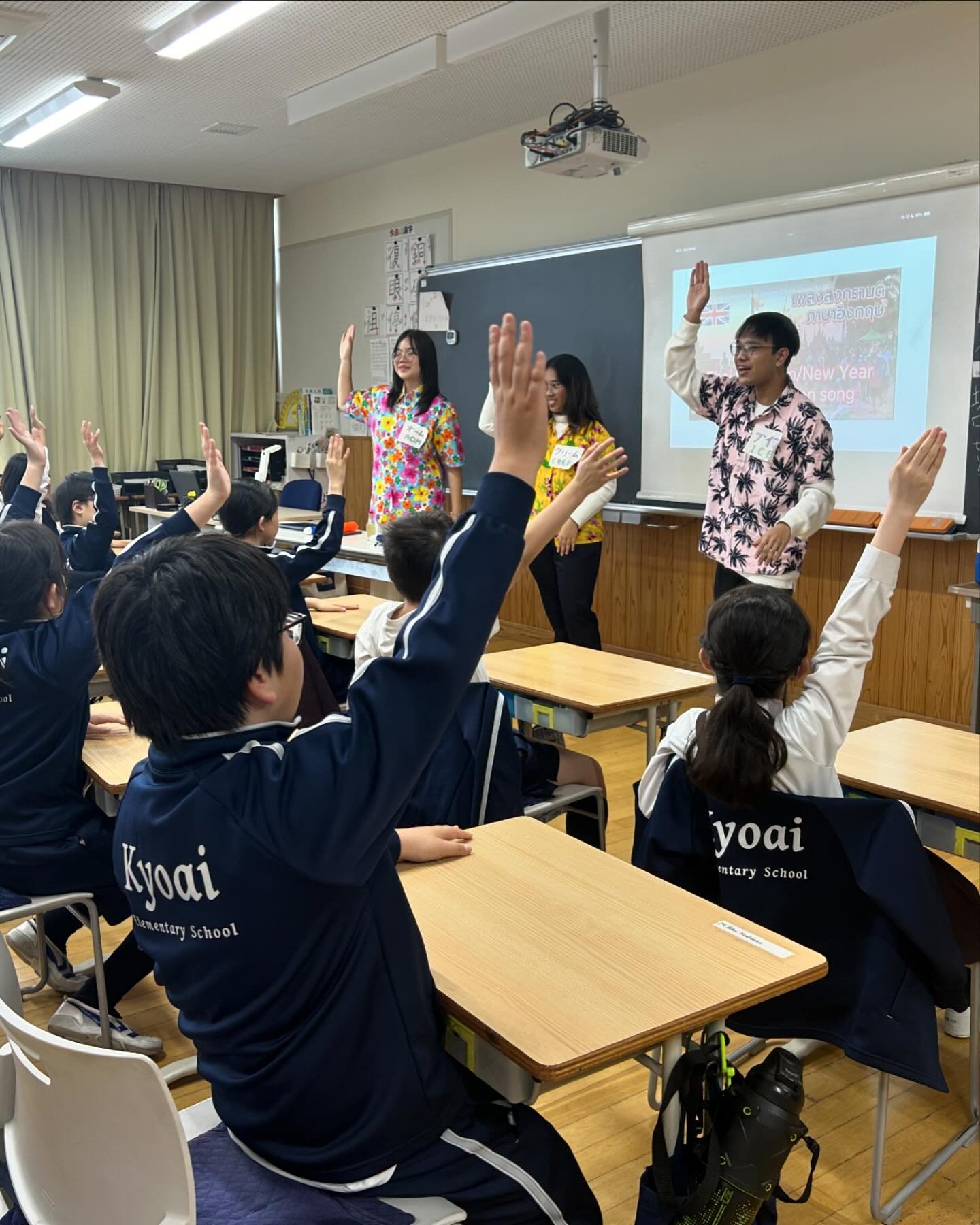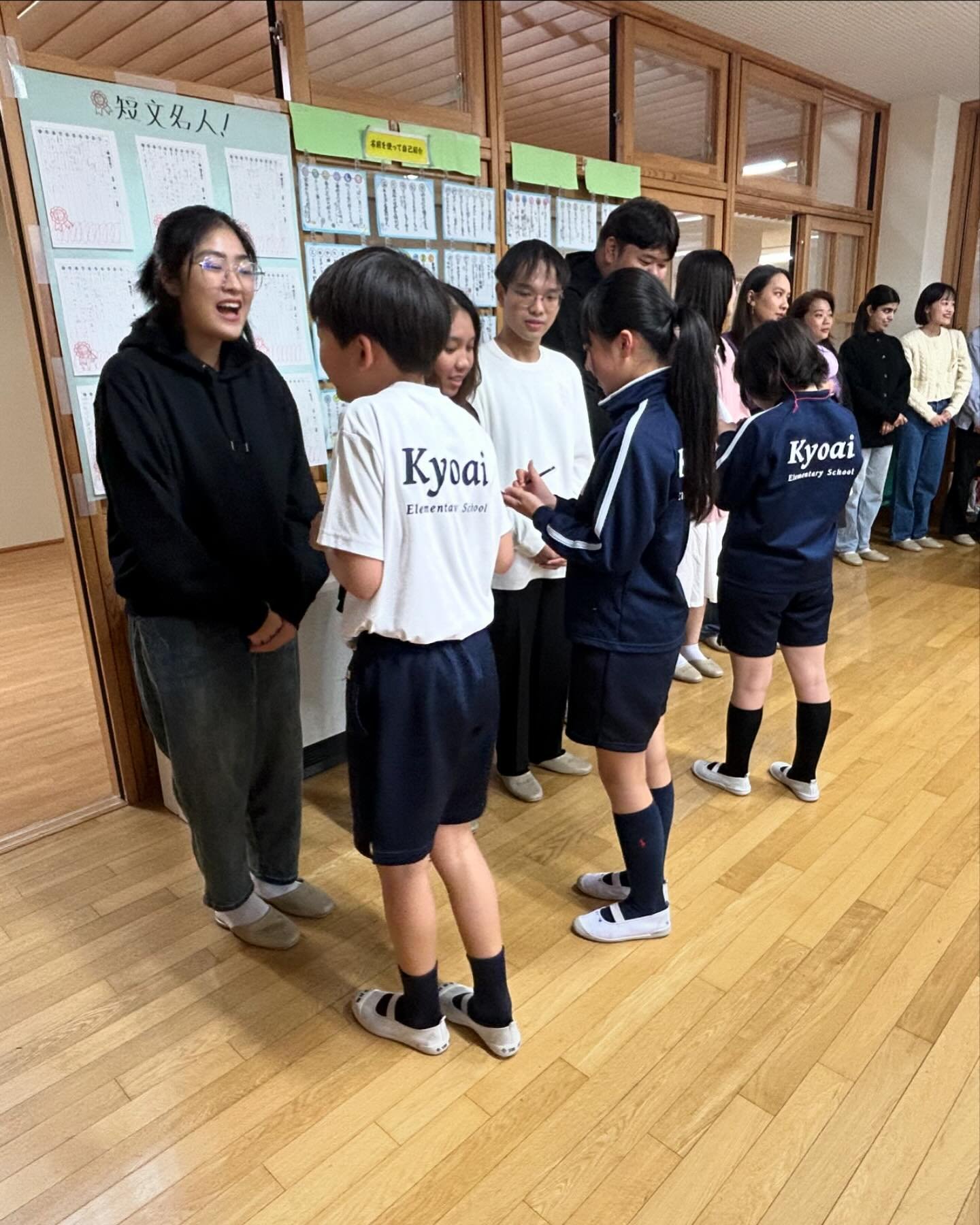 今回来日した学生たちは、将来、英語教師を目指している教育学部の学生で、本学園の小学校にて、英語の授業を行って頂きました。また、日本の学校ならではの学校給食やお掃除も一緒に体験し、タイの学校と比較しながらたくさんのことを吸収していました。お掃除のあとは、共愛小の先生に日本の先生の働き方について熱心に質問をしていました。
