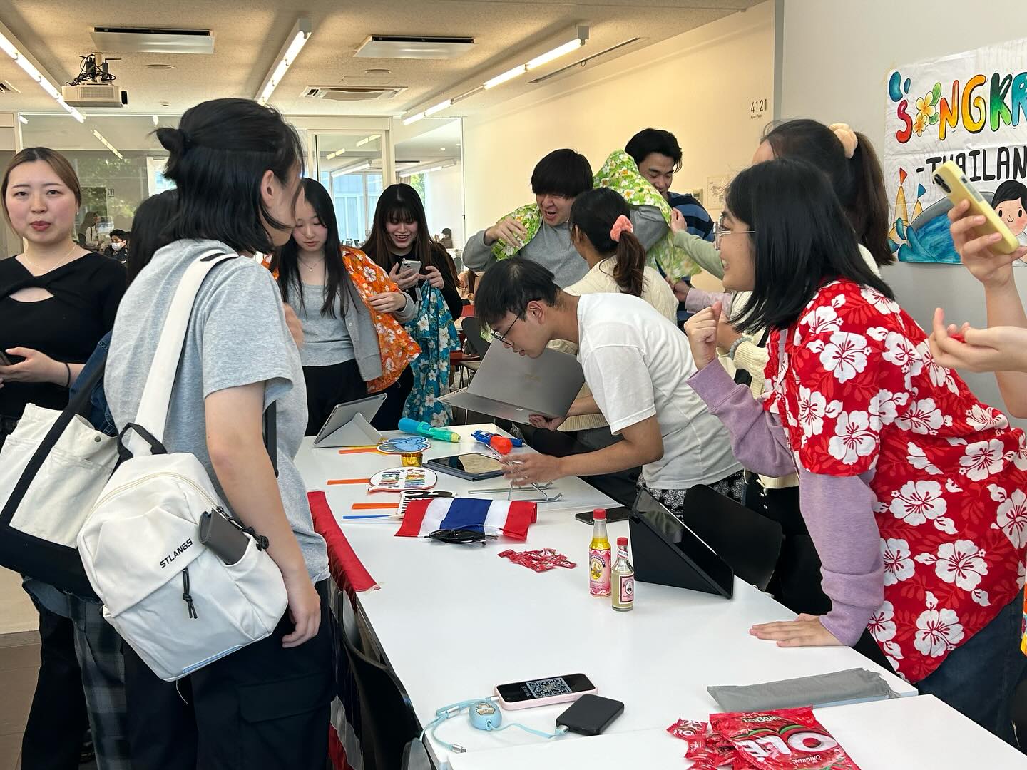 翌日には、学びの場を大学キャンパスに移動して、タイのお正月「ソンクラーン」の体験ができるコーナーを作り、タイ文化紹介コーナーを作り、本学の学生と積極的に交流してくれました。