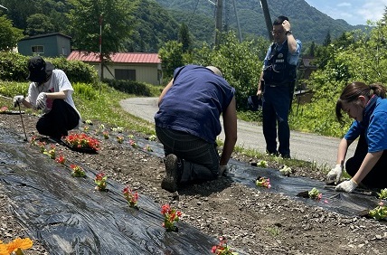 みまもり隊では同町役場から依頼されている花植え事業のお手伝いを行い、耕作放棄地の再利用と景観保護の役割を担いました。余った花は住民の方々に配り、そこでたくさんのコミュニケーションを取ることができました。