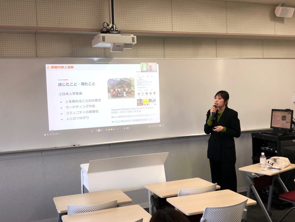 タイ・バンコクにて約3ヵ月間企業で業務に従事する「海外長期インターンシップ」に参加した学生の報告会が行われました。