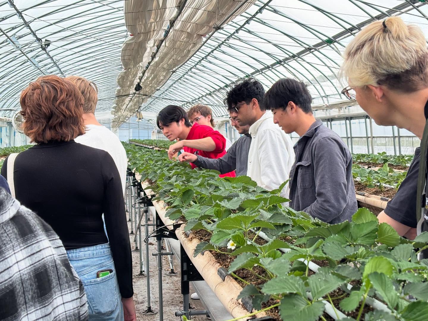 翌日は、夏出荷のいちご栽培に取り組む農家を訪問。自然エネルギーを活用し、立ったまま作業ができる工夫や、子育て世代や高校生も参加可能な雇用形態の工夫など、持続可能な農業の実践について話を伺いました。また、スマートフォンアプリを用いた遠隔管理の導入など、IT技術の活用も紹介されました。訪問後は地域交流センターでディスカッションを行い、学生同士での学びの共有を深めました。