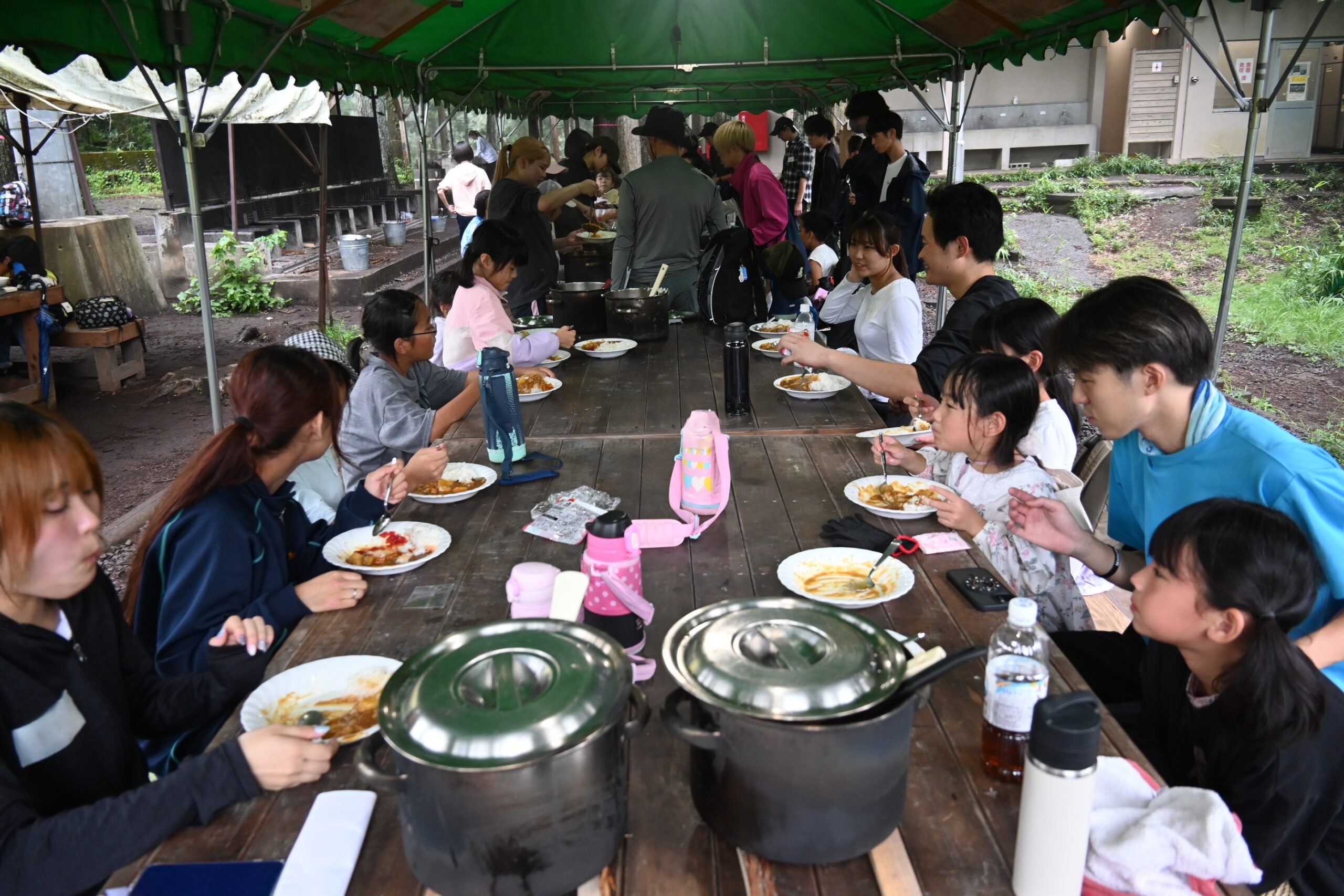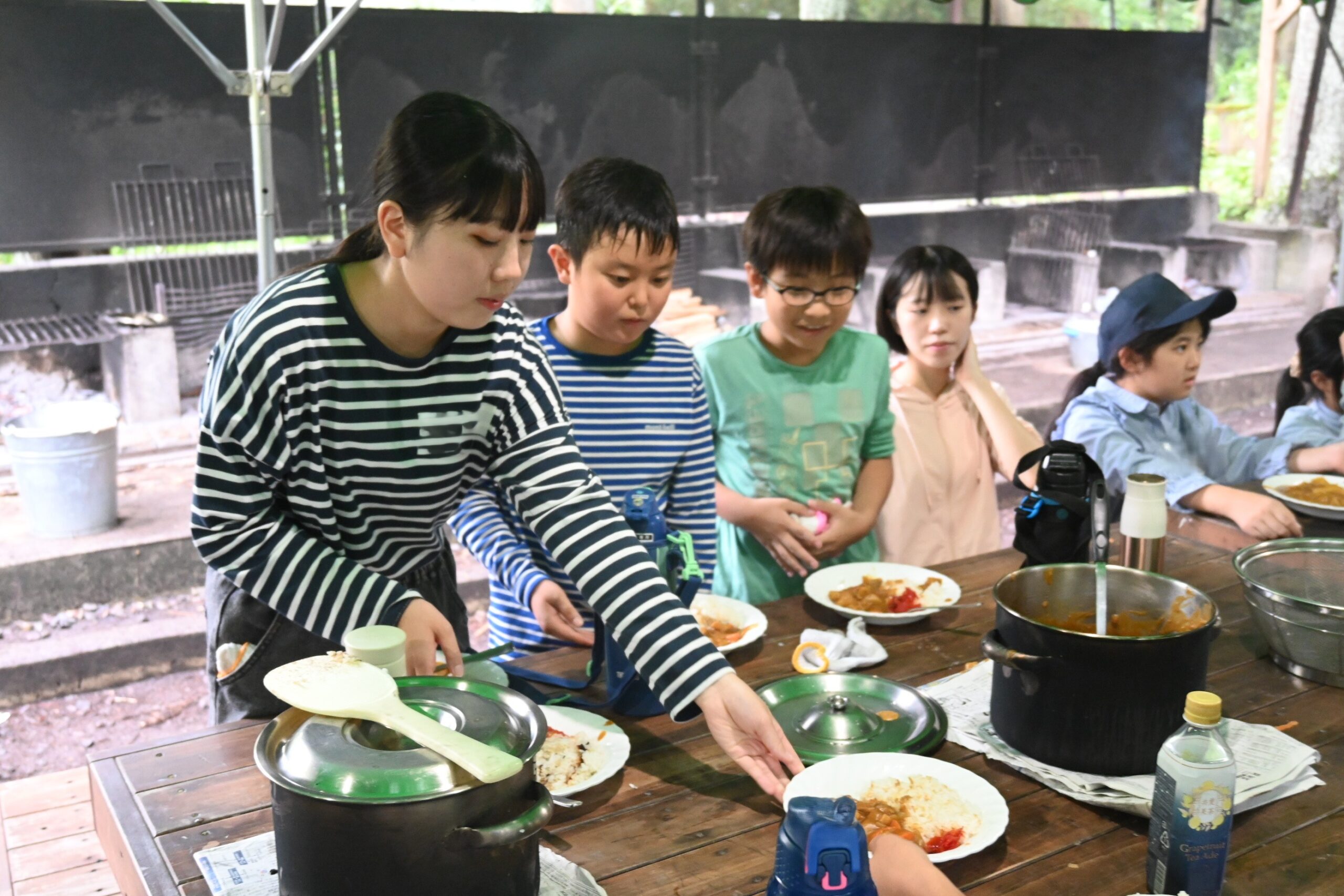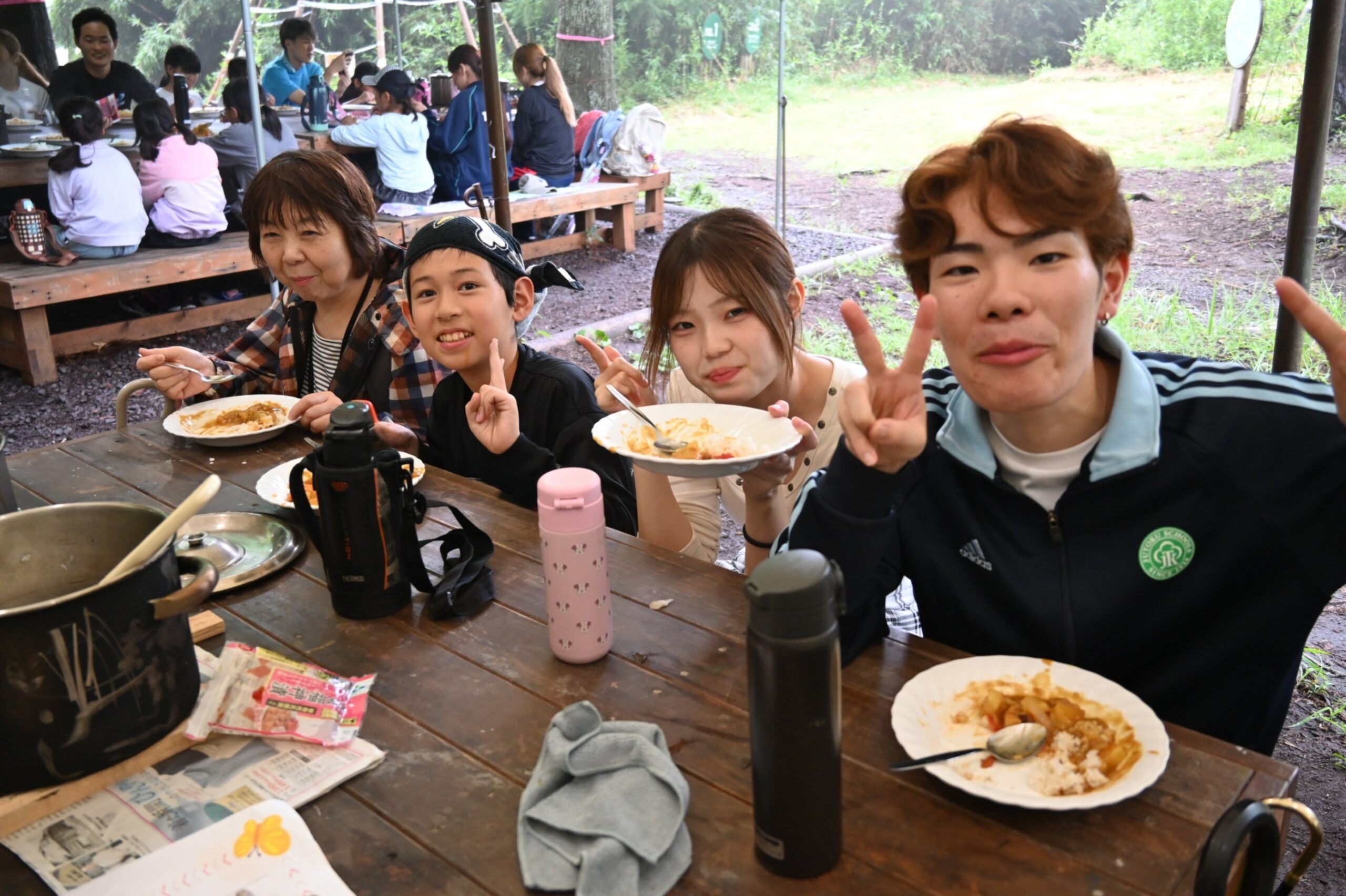 開催初日はあいにくの雨でしたが、参加した児童たちは学生たちと協力しながら、おいしいカレーを完成させました。2日目には天候も回復し、森の散策やクラフト体験も大きなトラブルなく無事に終了。閉会式では、すっかり打ち解けた学生と児童が、別れを惜しむようにタッチを交わし、記念撮影をする姿も見られました。この2日間の活動が児童のみなさんにとっても、学生にとっても、お互いに学びのあるものになったことを願っています。