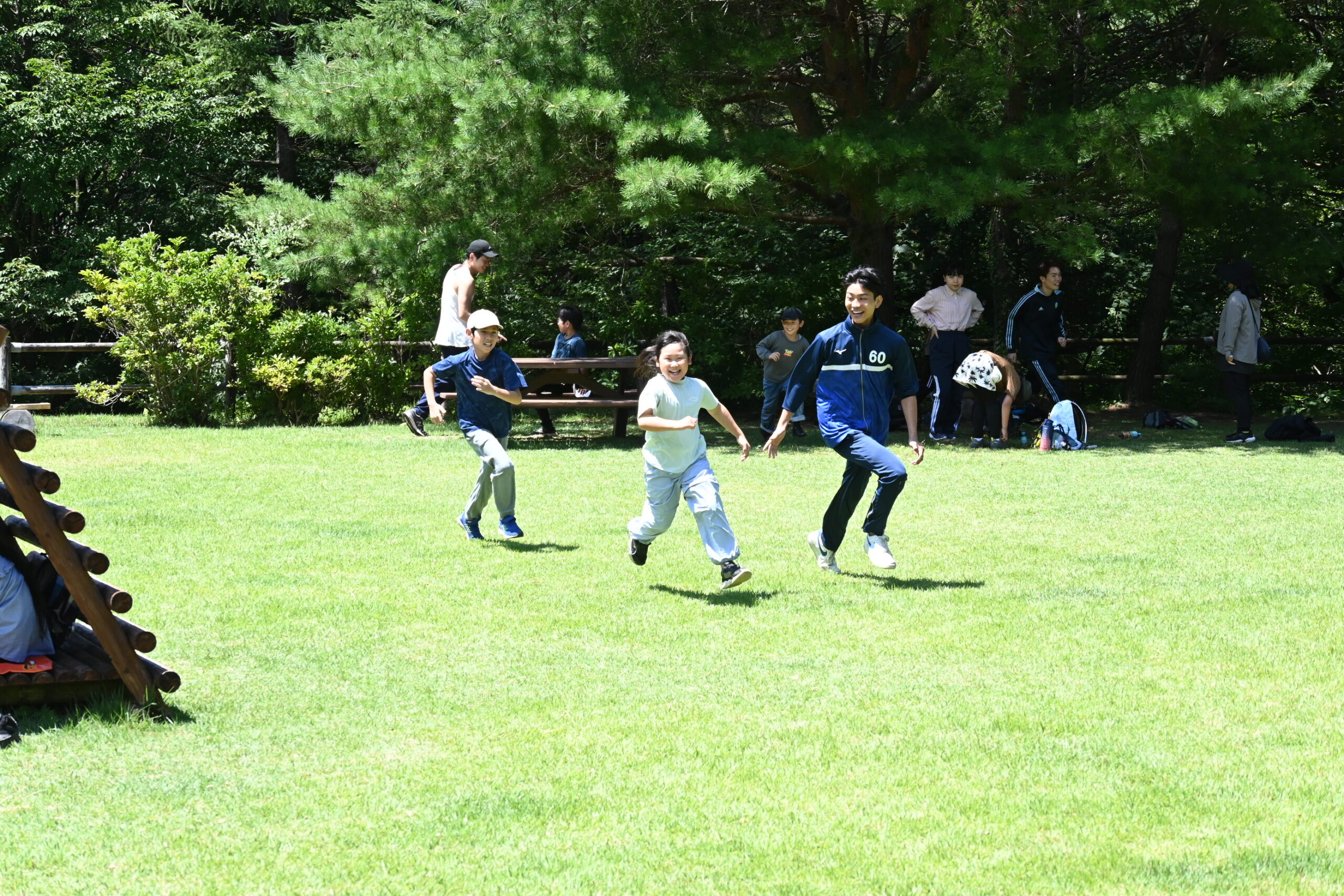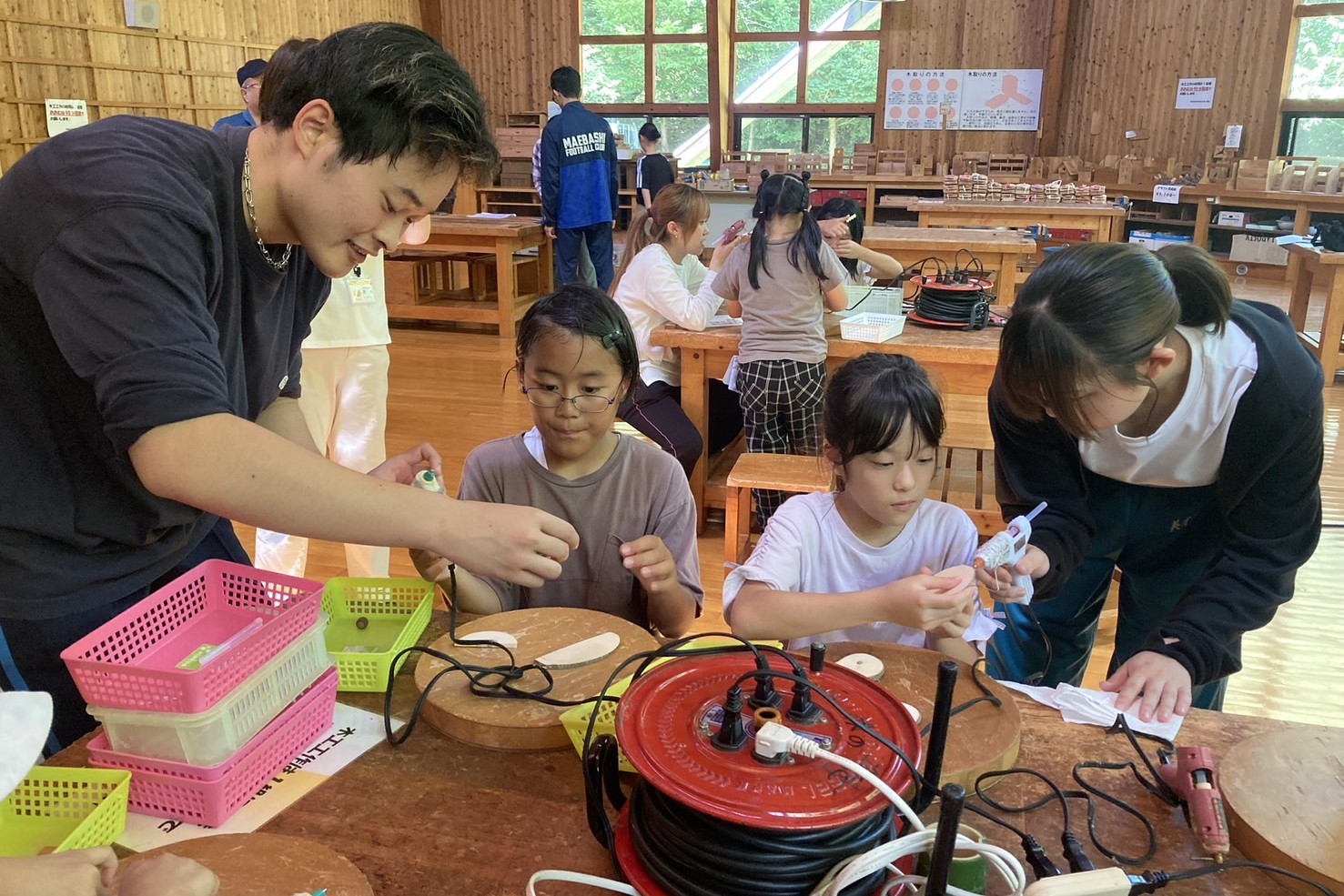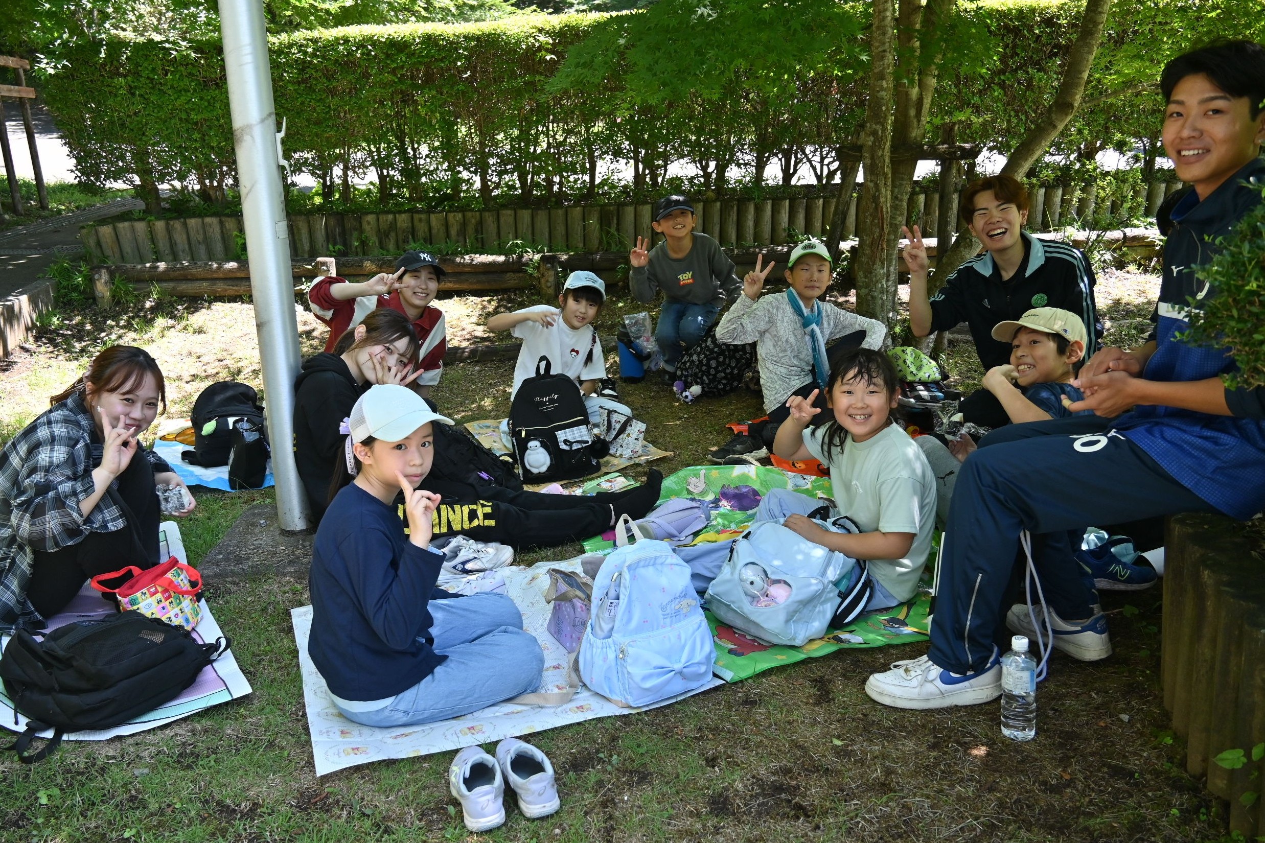 開催初日はあいにくの雨でしたが、参加した児童たちは学生たちと協力しながら、おいしいカレーを完成させました。2日目には天候も回復し、森の散策やクラフト体験も大きなトラブルなく無事に終了。閉会式では、すっかり打ち解けた学生と児童が、別れを惜しむようにタッチを交わし、記念撮影をする姿も見られました。この2日間の活動が児童のみなさんにとっても、学生にとっても、お互いに学びのあるものになったことを願っています。