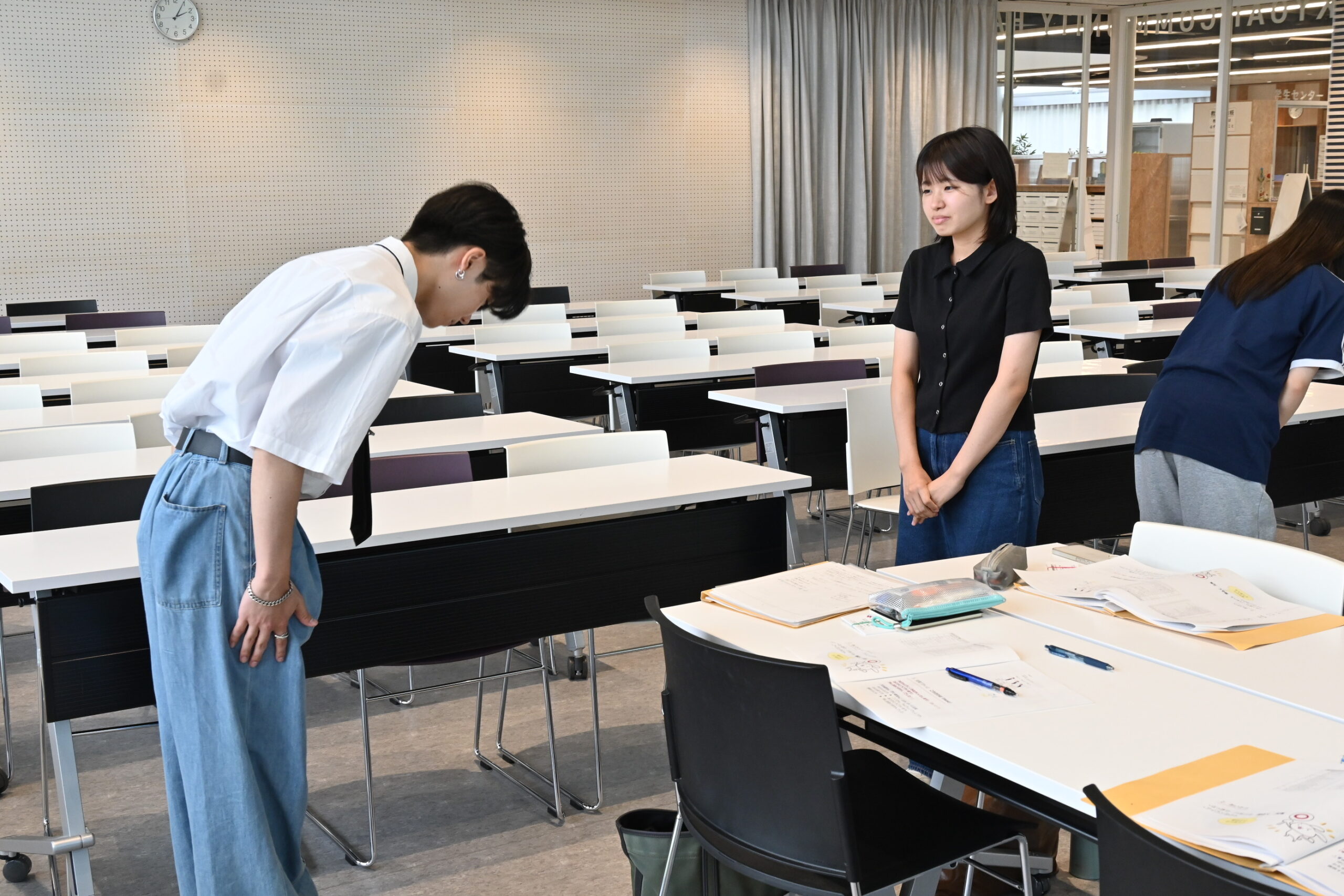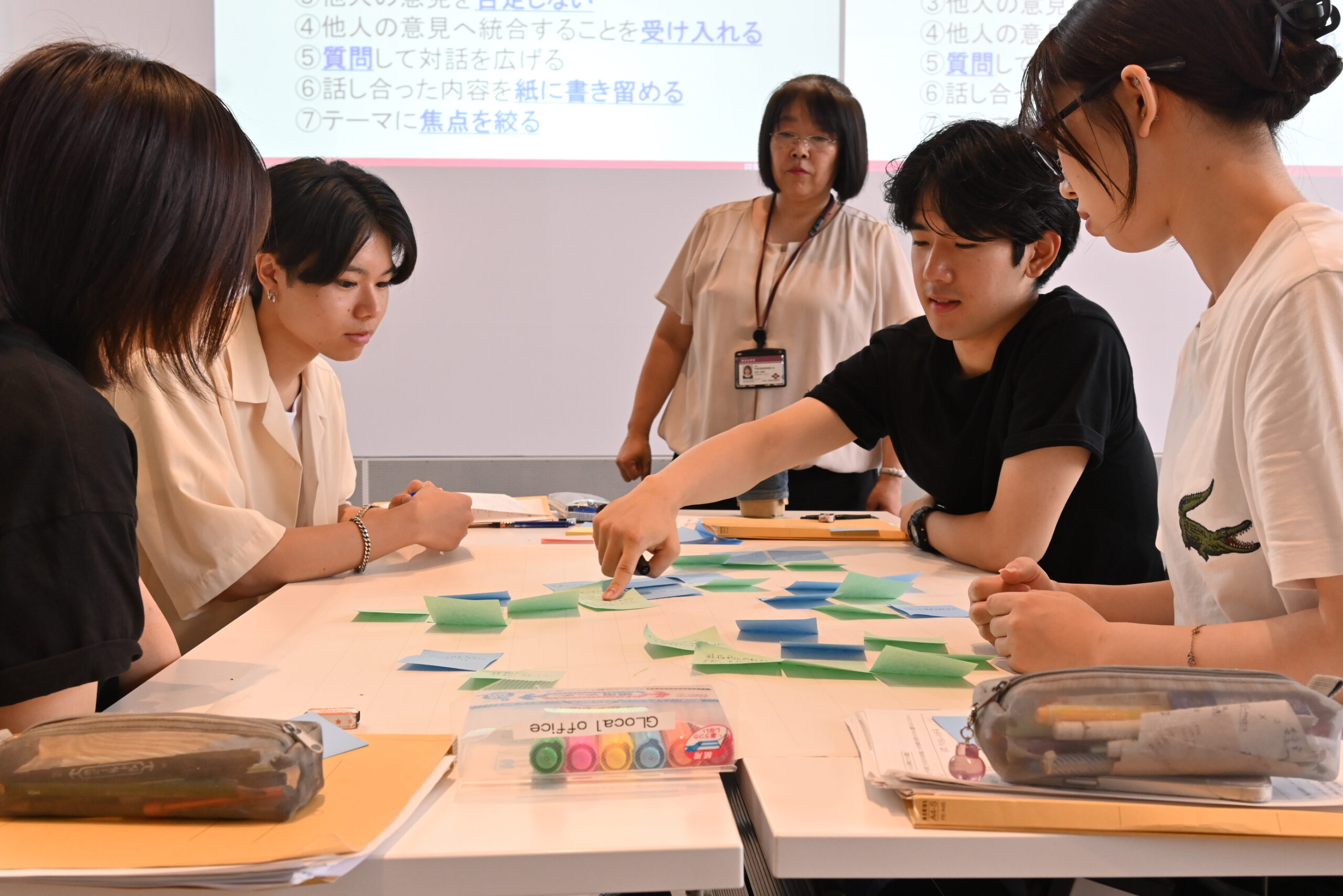 実務研修を前に、学生たちは5日間の事前研修を受けました。名刺の渡し方や電話の取次ぎ方、敬語についてなどビジネスマナーの基本を習得したほか、インターンシップを通じて「得たいもの」「学びたいこと」を履修生生同士で語り合い、「そのためにできることは何か」をグループワークで一つ一つ掘り下げました。