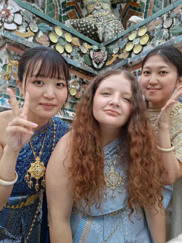 また、フランス人の友人と一緒にタイの伝統衣装を着て、観光名所であるワット・アルンを訪れました。伝統衣装を身にまとい、観光客で賑わう中で写真を撮る貴重な経験となりました。さらに、タイ人の日本語学科の学生と食事を共にし、文化や言葉を学びながら楽しい時間を過ごすこともできました。