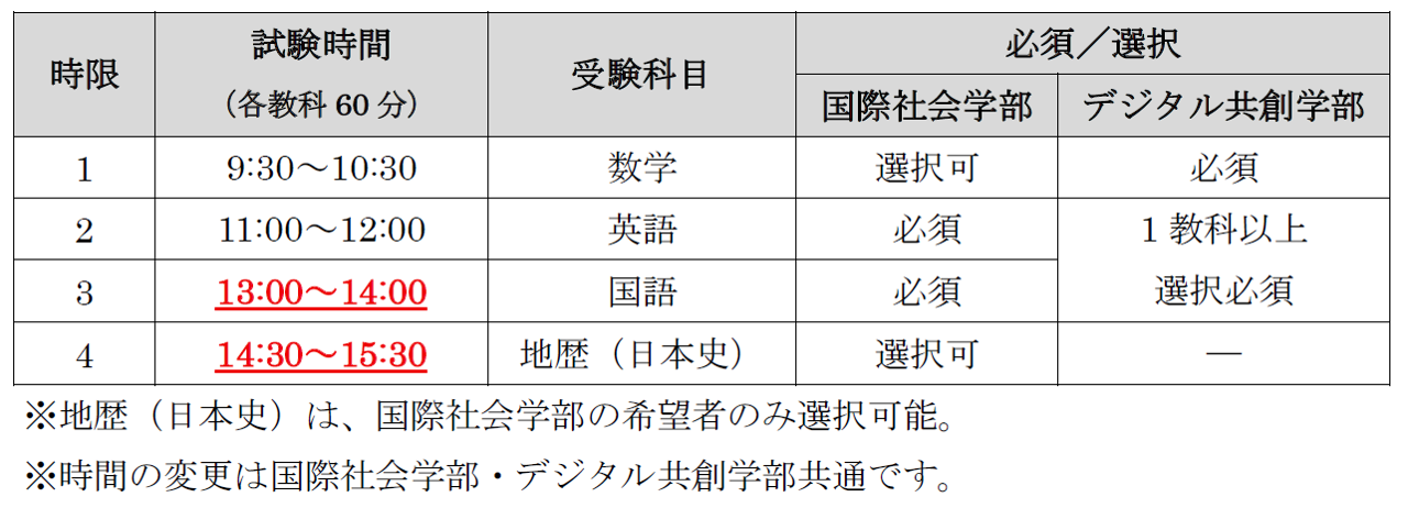 ・「国際社会学部」「デジタル共創学部」ともに上記の試験時間に変更になります。
