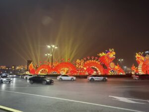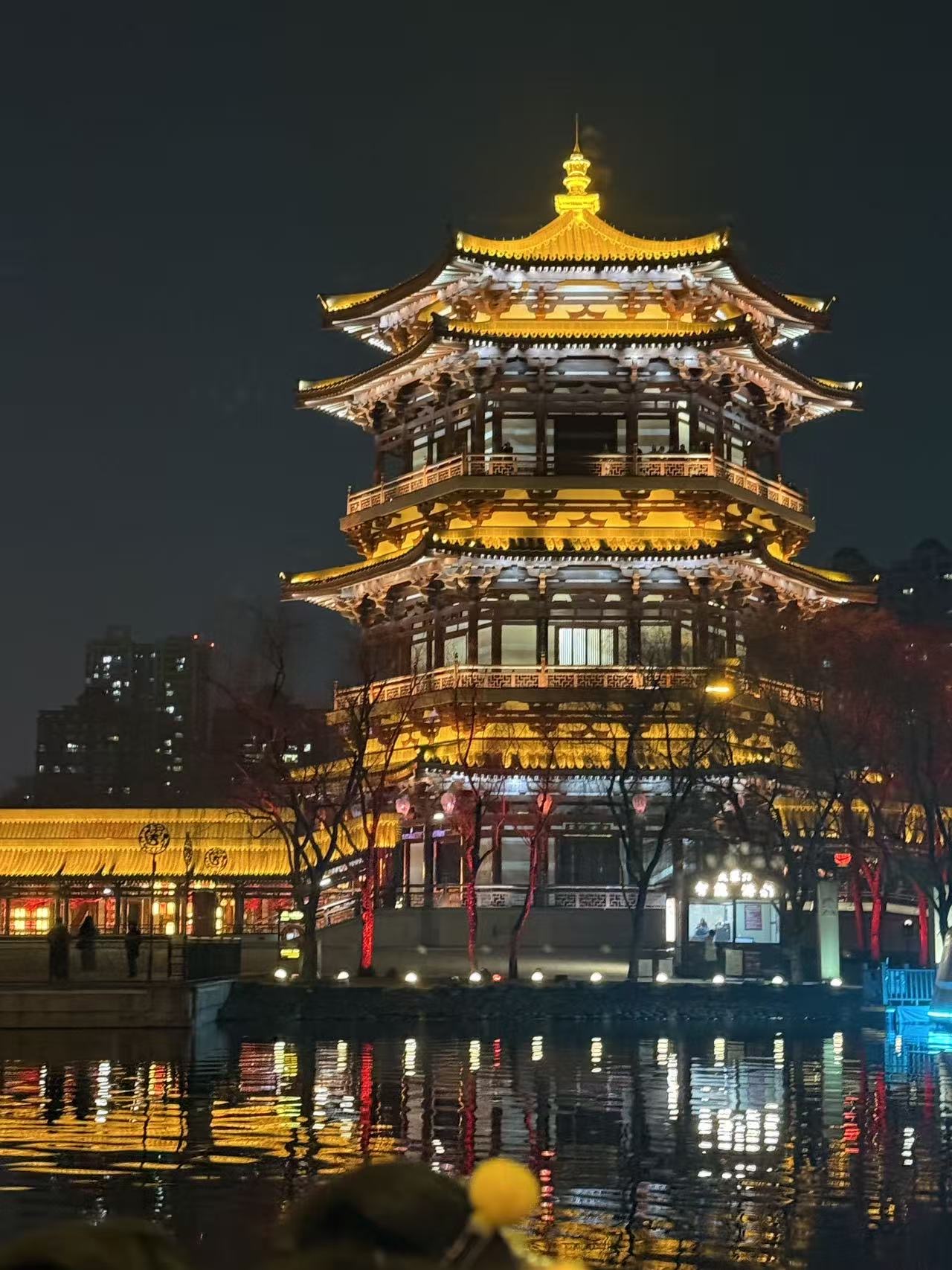 寮に残っていた留学生と一緒に、大唐芙蓉園も訪れました。ボスニアやルーマニアの友人と園内を散策し、中国の歴史や文化に触れることができました。昼と夜で異なる景色を楽しむことができ、特にライトアップされた幻想的な風景が印象に残っています。